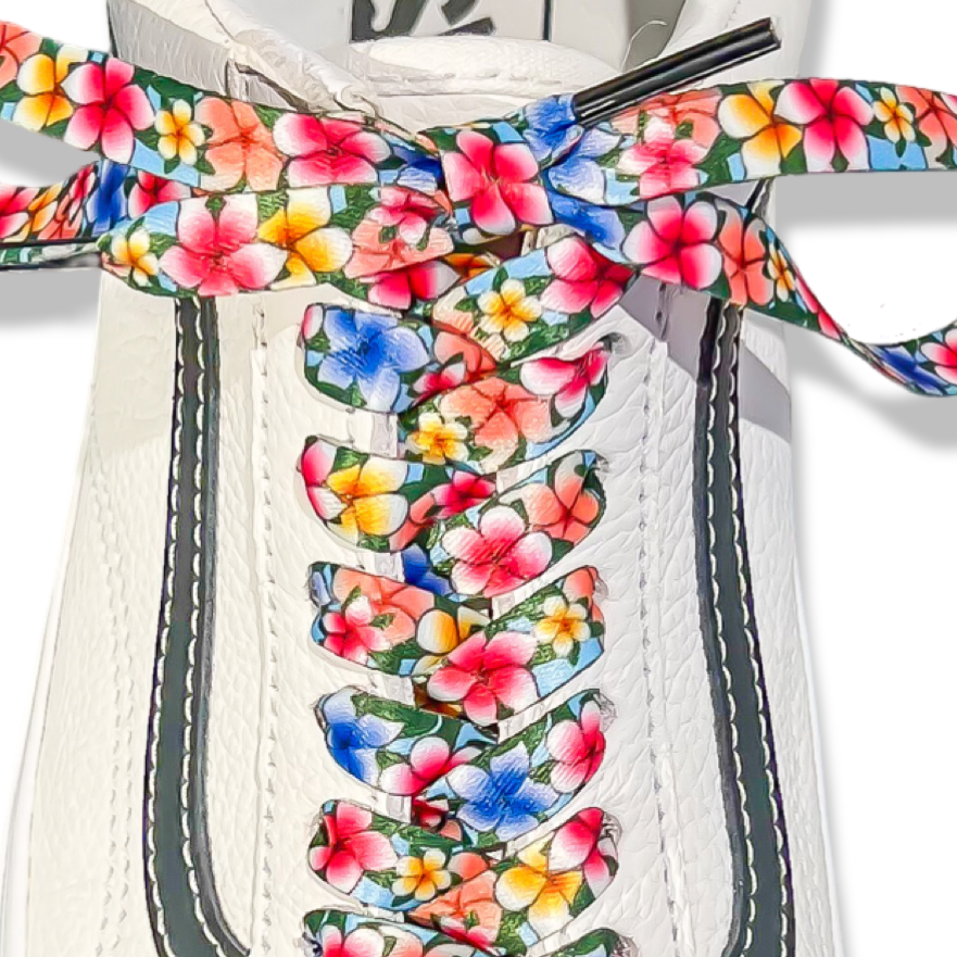 Plumeria shoelaces flat 100% recycled premium printed shoelaces in adult and child sizes.